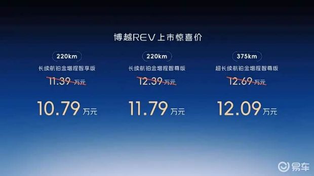 3月31日,吉利博越REV正式上市,包含三款车型,官方指导价区间11.39-12.69万元,上市惊喜价区间10.79-12.09万元。博越REV搭载吉利超级铂金增程与神盾金砖电池,CLTC纯电续航220km和375km,综合续航1400km和1525km。官方还同时宣布,吉利博越累计用户突破230万。