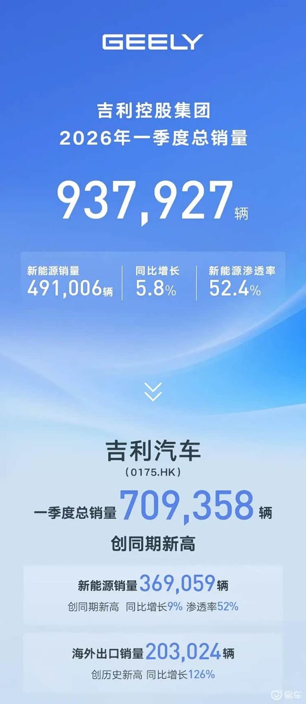 今日,吉利控股集团发布2026年第一季度销量数据:总销量937927辆,新能源销量491006辆,同比增长5.8%,新能源渗透率52.4%。