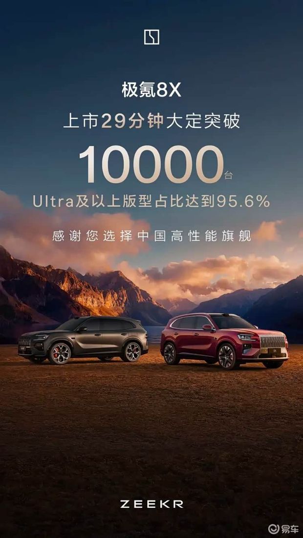 极氪汽车官方宣布,极氪8X上市29分钟大定破万,其中Ultra及以上版型占比高达95.6%。