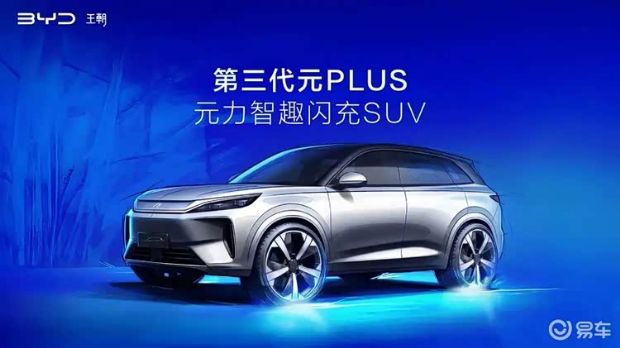 4月20日,比亚迪正式发布了第三代元PLUS车型的预告图,并表示该车将于北京车展上正式发布。新车延续了家族设计语言,值得一提的是还将搭载第二代刀片电池以及比亚迪最新的闪充技术。