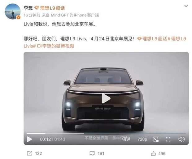 4月20日,理想汽车CEO李想在社交媒体上发布了一则全新一代理想L9 Livis实车视频,并表示该车将于4月24日开幕的北京车展上正式发布。