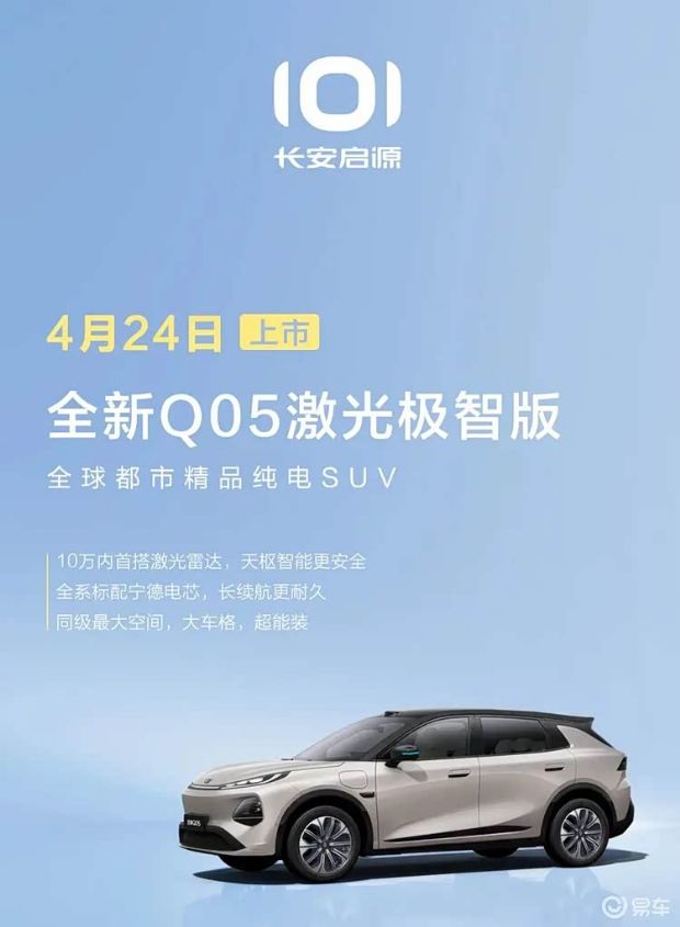 4月20日,长安汽车发布“智启焕新季”新品预告,长安启源全新Q05激光极智版将在4月24日正式上市,新车定位全球都市精品纯电SUV。