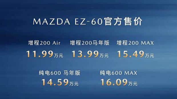 4月21日,我们从官方获悉,马自达EZ-60马年版迎来上市,共推出2款车型,售价13.99-14.59万元。车辆基于长安EPA平台打造,定位中型SUV,提供纯电和增程两种动力,其中增程动力车型搭载1.5L增程器,CLTC纯电续航达到200km。纯电车型搭载磷酸铁锂电池,CLTC纯电续航达到600km。
