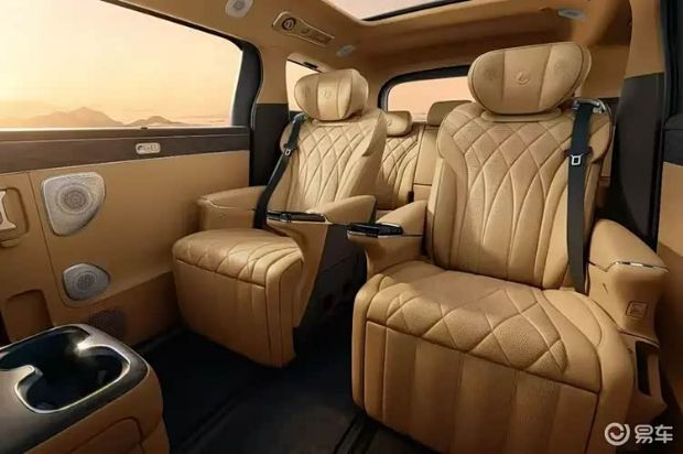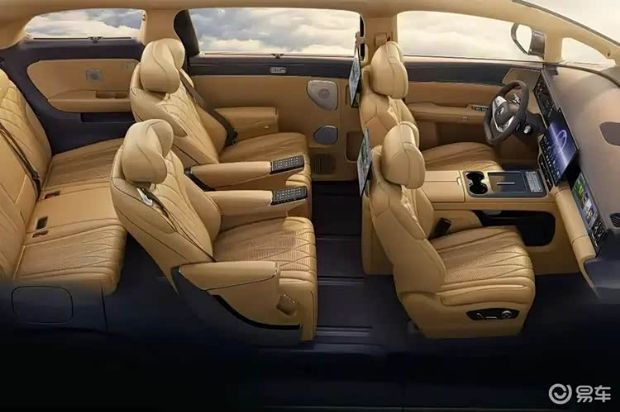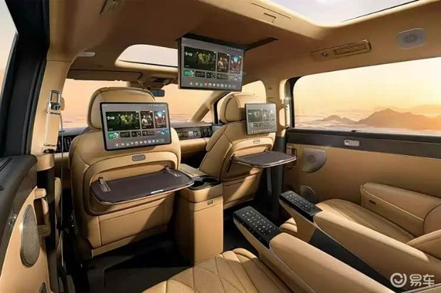 内饰方面,新车采用了经典的T字形布局,第二排座椅配备了航空座椅和小桌板。此外,新能源车流行的二排屏幕也并未缺席,同时新车还在座椅后面还配备了两个液晶显示屏。