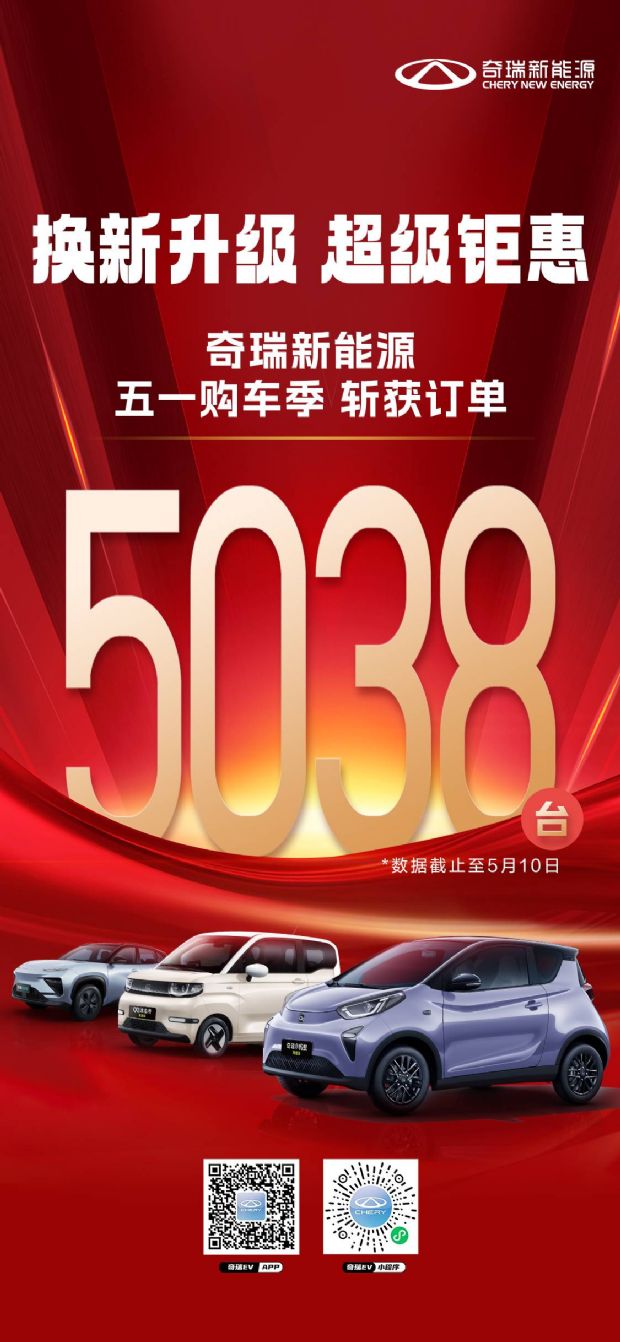 叮!奇瑞新能源五一购车季成绩新鲜出炉,斩获订单5038台!