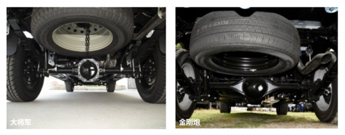 反观金刚炮,在平台方面,金刚炮沿用低端产品风骏老平台,因此在底盘架构和车身稳定性方面,金刚炮难以与大将军匹敌。而下置板簧的悬挂处理方案搭配245/70R17的小轮胎则更使金刚炮通过性能表现与载运性能表现“雪上加霜”。无论是驾驶体验还是运输效率,都展现出更为出色的表现。因此基于P3平台的大将军赢得十分彻底,可谓硬气十足!