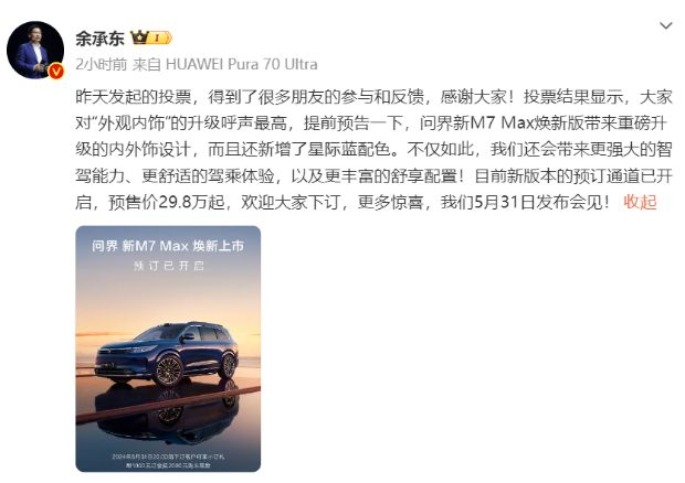 5月16日,余承东在微博上率先点燃了汽车圈的期待之火,他宣布问界新M7新增版本即将问世,并引发了网友对新车外观内饰、智驾能力、驾乘体验和舒享配置的热烈讨论和投票。短短时间内,网友的参与度与投票热情便如潮水般汹涌,足见问界新M7 Max焕新版的市场潜力与消费者期待。