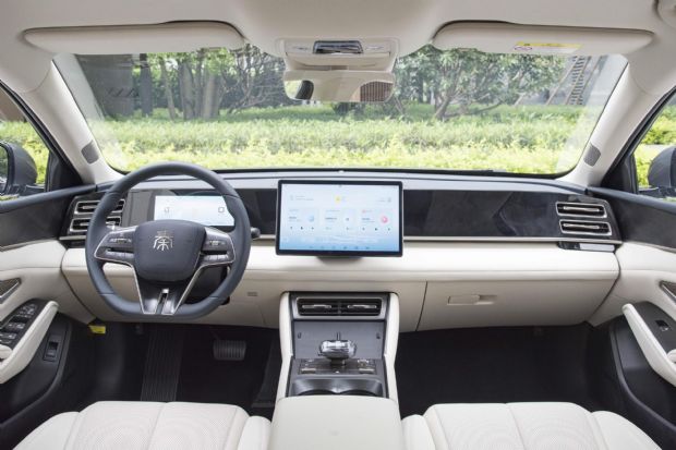 内饰方面,秦L内饰设计灵感来源于中国山水画,整体中控饰板采用了一体式设计,看上去更加的大气。新车采用内嵌式大尺寸液晶仪表搭配15.6英寸可旋转中控屏,全新样式的三辐式多功能方向盘以及无线手机充电等配置的加入,增加了一定科技感,满足当下用户用车需求。