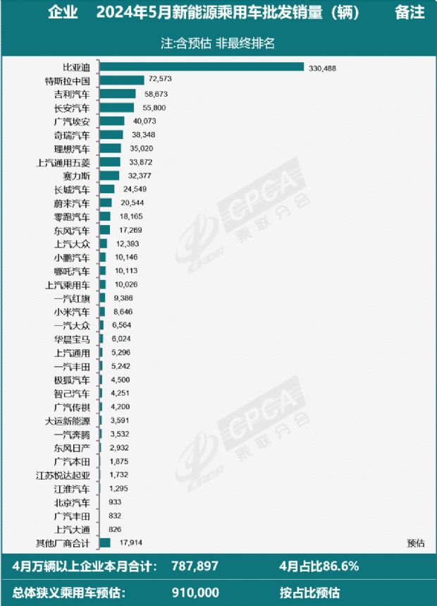 【2024年5月新能源乘用车批发销量排行榜】虽然5月份国内乘用车市场销量同比有所下滑,但新能源乘用车市场依然保持强劲的增长势头。据乘联会初步统计,2024月5月全国新能源乘用车厂商批发销量达到91万辆,同比增长35%,环比4月份增长16%。