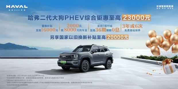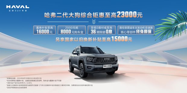 用户购买哈弗二代大狗及混动版车型可享受23000元的现金优惠,置换用户还可享受最高16000元的置换补贴,另有2000元抵8000元购车金、至低0首付或至高36期限额0息、3年或6次免费基础保养、首任非营运车主发动机变速器核心零部件终身质保等一系列缤纷好礼。另外,用户购买哈弗二代大狗还可享受国家以旧换新至高补贴15000元(混动版至高补贴20000元),诚意可谓给到了极点,让更多的消费者有机会享受轻越野带来的无限驾驶乐趣。