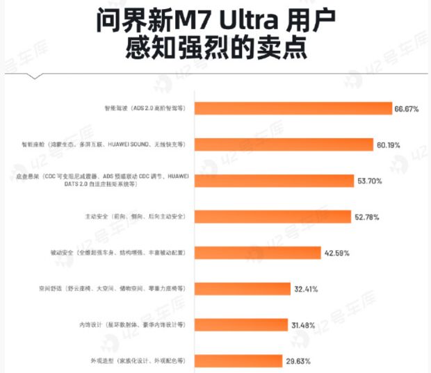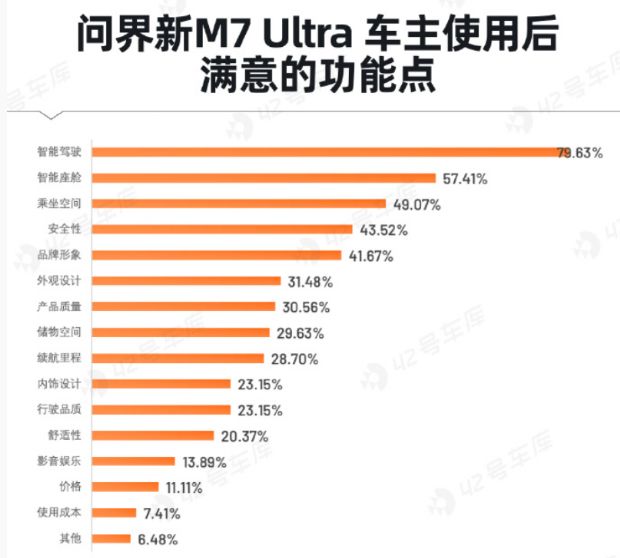 根据42号车库的调研数据,70%的用户年龄在26-35岁之间,而且这些车主广泛分布于各级城市中,其中一线城市数量相对更多,绝大多数人拥有本科及以上学历。之所以拥有很多的年轻用户,这是因为它更加智能,更符合年轻人的使用习惯。而且,根据调研显示,智能驾驶、智能座舱与底盘悬架,这样的新“三大件”是用户提及率最高的功能卖点。