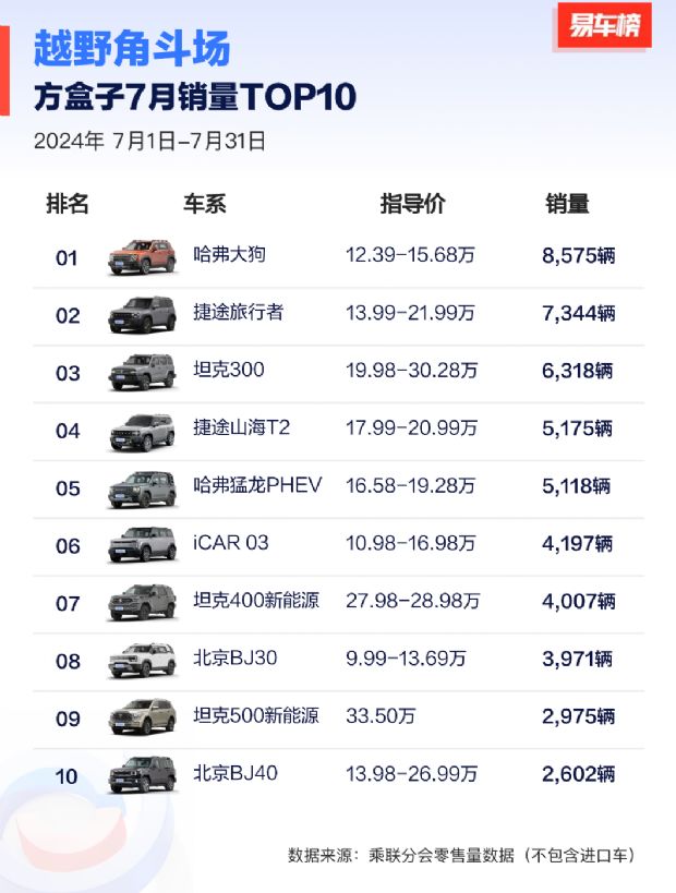根据易车整理的终端销量数据显示,7月方盒子车型销量前两名仍然是哈弗大狗和捷途旅行者,销量分别为8,575辆、7,344辆,前者领先1200余辆,优势不小。
