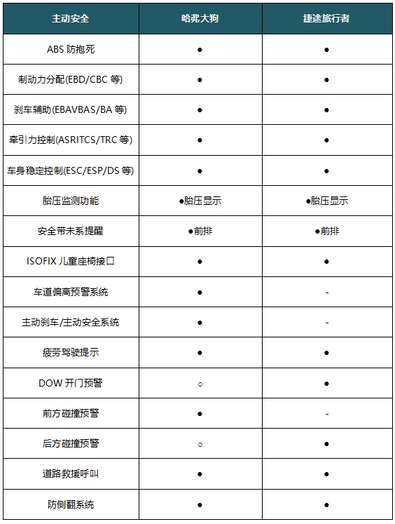哈弗大狗和捷途旅行者主被动安全配置都极为丰富。在主动安全方面,两者均配有ABS防抱死、刹车辅助、牵引力控制等,但哈弗大狗多了车道偏离预警系统、主动刹车/主动安全系统及前方碰撞预警功能,捷途旅行者则多了DOW开门预警与后方碰撞预警功能。不过,在被动安全方面,哈弗大狗拥有六个安全气囊,而捷途旅行者只有四个。