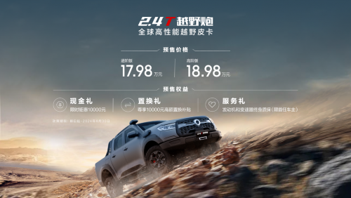 8月15日,长城炮倾力打造的品类创新力作——2.4T越野炮正式开启预售,以卓越性能优势,引领中国皮卡品类价值跃升。2.4T越野炮进阶版预售价17.98万元、高阶版预售价18.98万元,用户可通过线上长城炮APP或线下经销门店下单抢购。预订用户还可尊享“现金礼、置换礼、服务礼” 三重大礼,价值拉满,诚意满满。