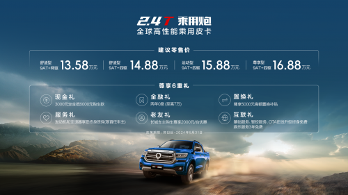 同时,长城炮为购车用户推出“现金礼、金融礼、置换礼、服务礼、老友礼、互联礼”六重购车大礼,价值拉满,诚意满满。2.4T乘用炮定位“全球高性能乘用皮卡”,基于坦克平台,以乘用车标准打造,够劲、够省、够可靠,强势引领中国皮卡品类价值向上跃升。