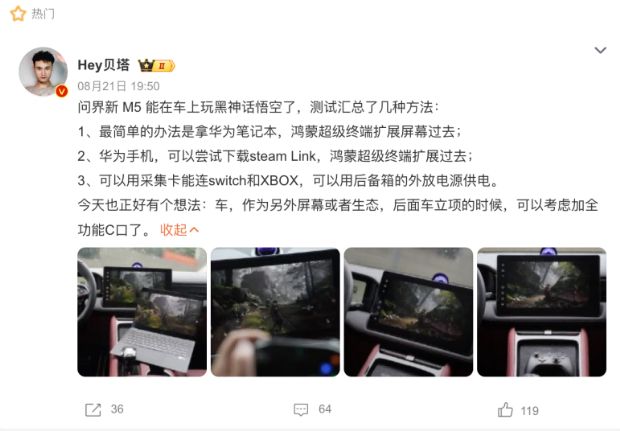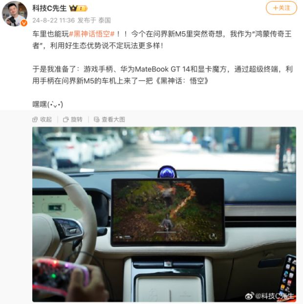 近期,国产第一款3A游戏《黑神话:悟空》上线后引发了大量玩家参与,最高在线玩家超过了224.3万人。玩游戏的设备也是五花八门,除了常规的PC、PS5,还有人将游戏搬入了车内,通过车机进行畅玩。近日,问界新M5的车主们纷纷在微博晒出自己在车内体验《黑神话:悟空》的照片,在车里“直面天命”的画面引来众多网友强势围观。