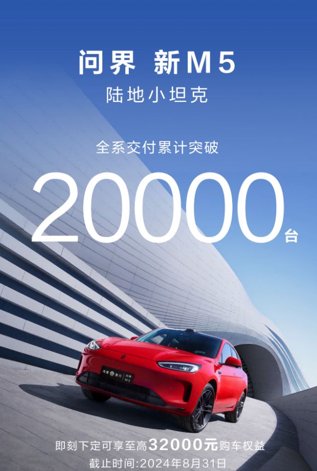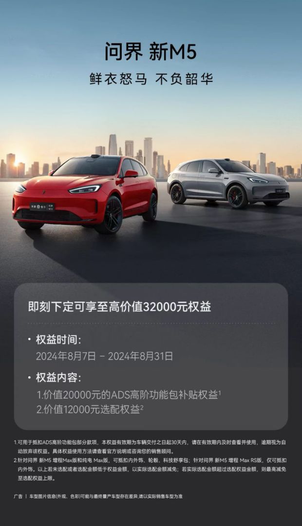 更重要的是,截止8月31日前下定问界新M5还可享受价值32000元的选配权益,包括价值20000元智驾权益补贴、价值12000元选配权益。相信在丰富的购车权益下,其未来销量势必会实现进一步增长。