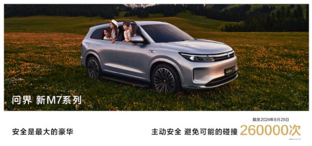 主动安全方面,问界新M7 Pro前向AEB自动紧急制动生效范围4-130km/h,刹停时速提升至110km/h,侧向防碰撞生效范围40-130km/h。此外,问界新M7 Pro还标配ELKA紧急车道保持辅助,人驾模式下,在车辆偏离当前车道且存在与他车碰撞、驶离道路边界等风险时,紧急辅助驾驶员转动方向盘以规避和减轻碰撞风险。2023年9月-2024年8月,问界新M7系列主动避免可能碰撞次数超260,000次[4],有效降低事故风险。