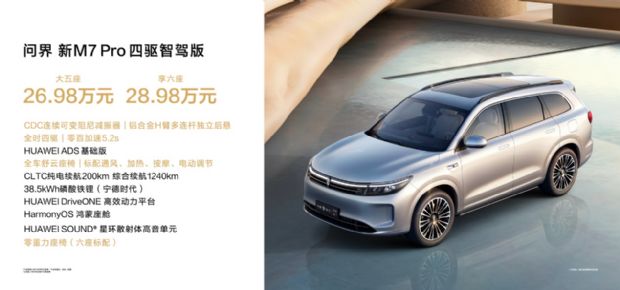 问界新M7 Pro系列官方指导价为:问界新M7 Pro五座后驱智驾版24.98万元,问界新M7 Pro六座后驱智驾版26.98万元,问界新M7 Pro五座四驱智驾版26.98万元,问界新M7 Pro六座四驱智驾版28.98万元。10月8日23:59:59前下定问界新M7 Pro的首批用户,可享受至高价值22,000元的购车权益,包括12,000元选配金[5]、5000元ADS智驾功能升级权益[6],以及免费升级为价值5000元的问界新M7 Ultra同款电池包周年庆权益[7]。10月8日23:59:59前下定问界新M7 Ultra的用户,可享至高价值38,800元的购车权益,包括12,000元选配金[8]、20,000元ADS智驾功能升级权益[9],以及赠送价值6800元的全自动舒享电动踏板周年庆权益。
