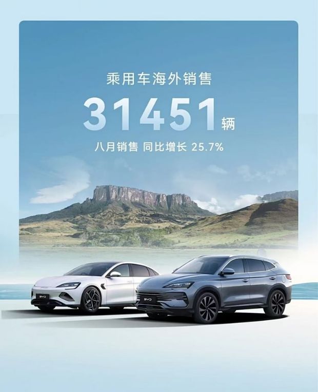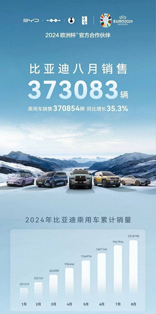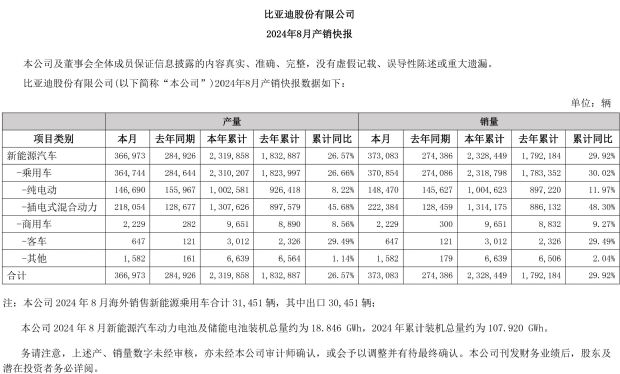 【比亚迪汽车8月销量快报】9月1日,比亚迪股份公布了其8月产销快报。快报显示,2024年8月比亚迪汽车销量再创历史新高,销量首次突破37万辆,达到373,083辆,同比增长36.0%。其中,乘用车销量370,854辆,同比增长35.3%;乘用车海外销量达到31,451辆,同比增长25.7%。