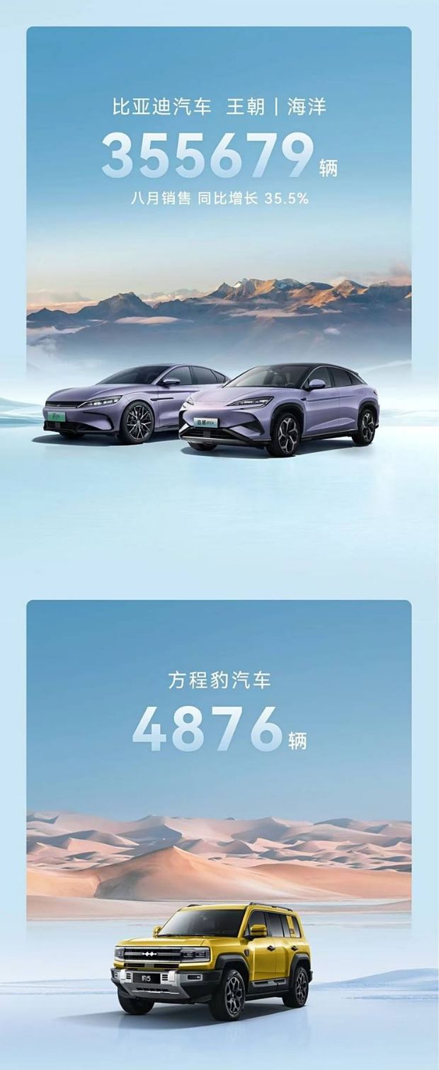 从各品牌销量来看,比亚迪王朝+海洋销量达到355,679辆,同比增长35.5%;方程豹品牌销量4876辆;腾势汽车销量9989辆;仰望汽车销量310辆。