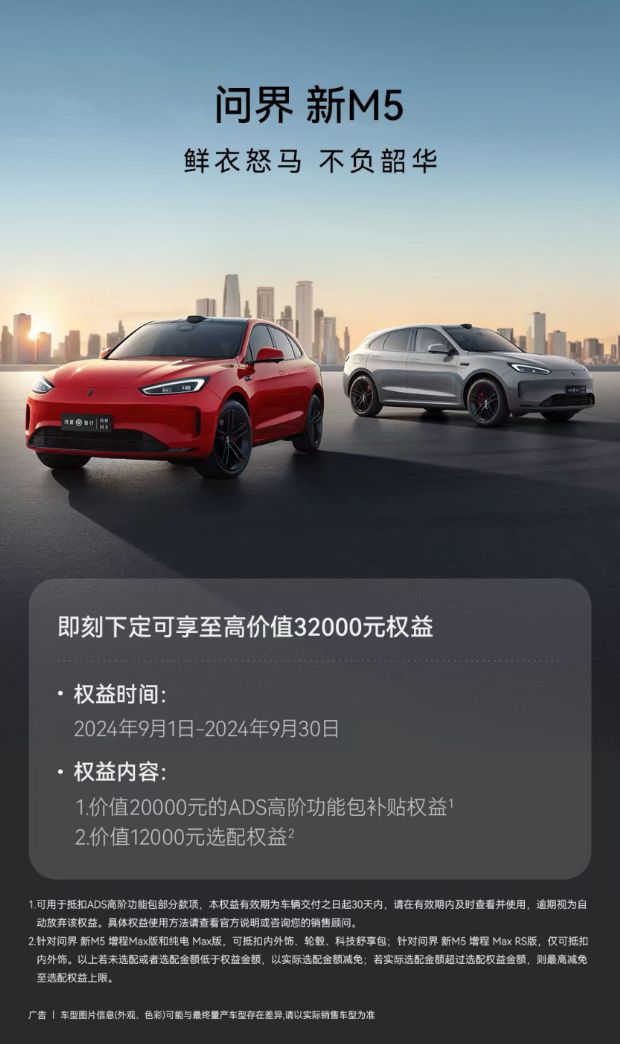 更重要的是,在金秋九月,问界官方还带来了丰富的购车权益,截止9月30日前下定问界新M5可享受价值32000元的选配权益,包括价值20000元智驾权益补贴、价值12000元选配权益。分期购车的用户还可享受悦享0首付权益,并且分期费率保持2.99%不变。