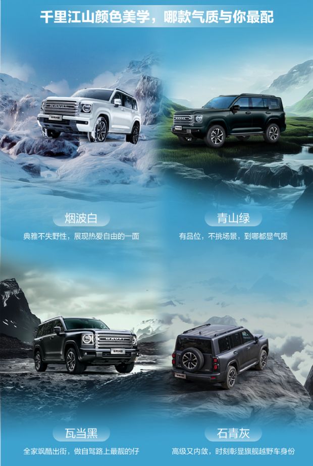 车身颜色其实是用户个性与性格特质的另一面。二代哈弗H9车身颜色采用千里江山美学设计,共有烟波白、瓦当黑、青山绿、石青灰4种颜色,每种颜色都有独特的韵味与寓意,适合不同性格特质与审美偏好的消费者。例如,石青灰的哑光质感营造出沉稳的氛围,适合性格沉稳、内敛的用户,而且这款配色与奔驰大G等百万豪车同款,即便同台相遇气场也丝毫不逊。