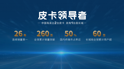 作为皮卡领导者,长城皮卡已连续26年销量第一,全球累计销量突破260万辆。国内终端市占率近50%,中国每卖出两台皮卡,就有一台是长城。长城炮诞生5年,全球累计用户突破60万,累计47个月销量过万,蝉联中国皮卡销量冠军,创造了“长城炮速度”,让皮卡走进千家万户,成为真正的国民车。