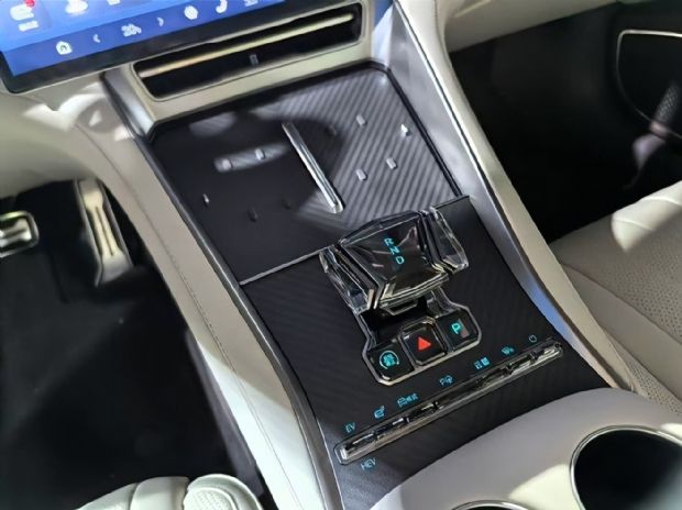 中央通道上配备了双50W的手机无线充电面板,实用性确实很不错,后方将会配备水晶电子档把,无论是样式还是手感,包括操作起来的便捷度,都做的非常优秀。在挡把后方则是实体按钮,这里可以快捷操作车辆的驱动形式、易三方、云辇-A、驾驶模式等。