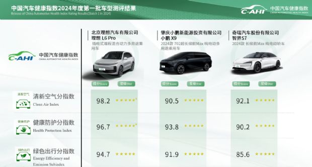 本次发布的C-AHI中国汽车健康指数2024年第一批次测评结果涵盖了理想L6Pro、小鹏X9、智界S7三款车型,发布了清新空气、健康防护、绿色出行三个分指数的测评结果。