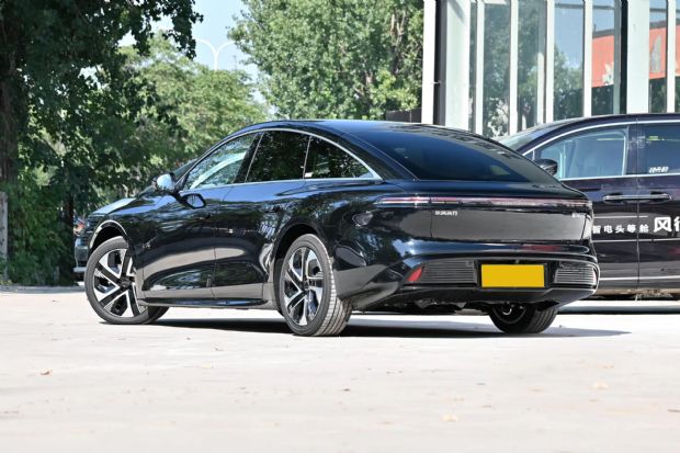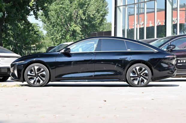 车侧部分,它轿跑风格的设计使得车顶的线条非常流畅,整车的风阻系数仅为0.191。新车的长宽高分别是4935/1915/1495mm,轴距为2915mm。另外它还标配了19英寸的半封闭式的低风阻轮圈,和它比较宽大的车身还是很搭的。