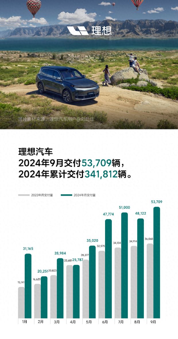 【理想汽车9月销量快报】10月1日,理想汽车官方率先公布了最新交付数据。数据显示,2024年9月理想汽车共交付53709辆新车,同比增长48.9%,这是理想汽车历史上第二次销量突破5万辆大关。与上月的48122辆相比,环比增长11.6%,销量增加了5587辆。