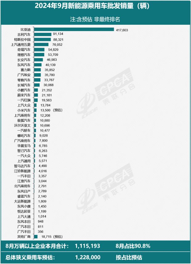 【9月新能源厂商批发销量排行榜】10月9日,乘联会公布了9月新能源厂商批发销量快讯。快讯显示,今年9月份全国新能源乘用车厂商预估批发销量122.8万辆,同比增长48%,环比8月份增长17%。