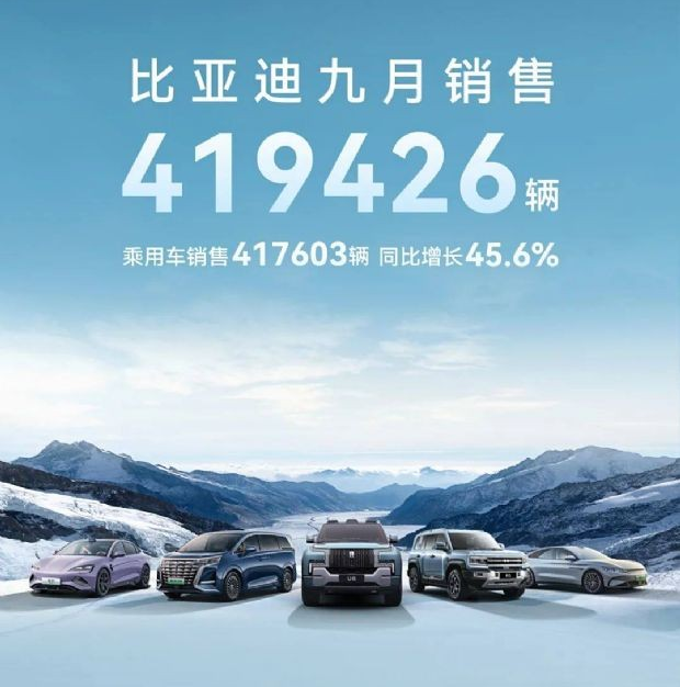 比亚迪汽车销量再创新高,9月销量首次突破40万辆大关,达到419,426辆。其中,比亚迪乘用车销量达到417603辆,同比增长45.6%;海外出口33,012辆;出口销量30,512辆。