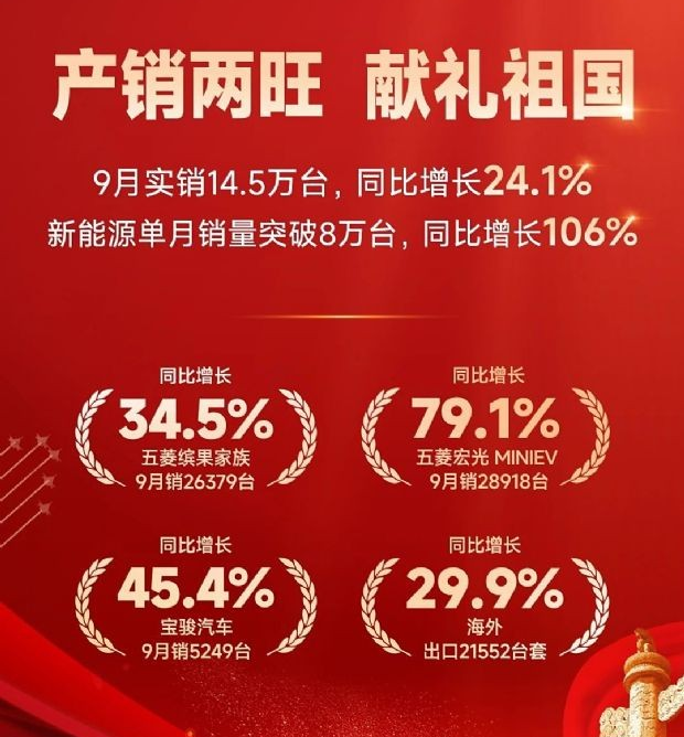 上汽通用五菱日前宣布,2024年9月上汽通用五菱实销14.5万辆,同比增长24.1%。新能源汽车表现出色,9月销量突破8万辆,同比增长106%。
