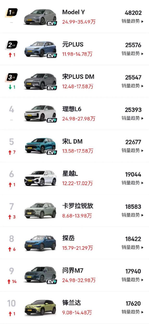 来自比亚迪的元PLUS和宋PLUS DM-i销量都达到2.5万辆,排名第二和第三位。上市不久的宋L DM-i销量22677辆,排名第五位。
