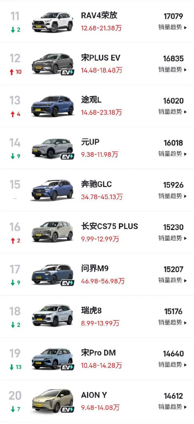 此外,来自丰田的锋兰达和RAV4荣放销量分别为17620辆和17079辆,排名第10和第11位。