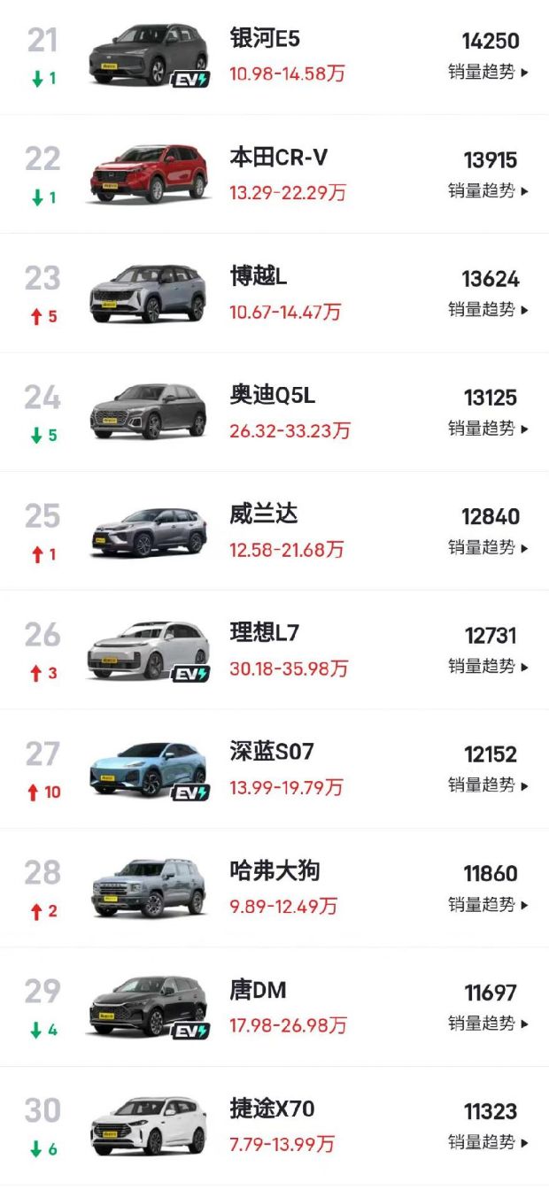 上市不久的紧凑型SUV吉利银河E5销量稳步增长,9月份以14250辆的销量排名第21位。本田CR-V销量也有所回暖,以13915辆的销量排名的22位。