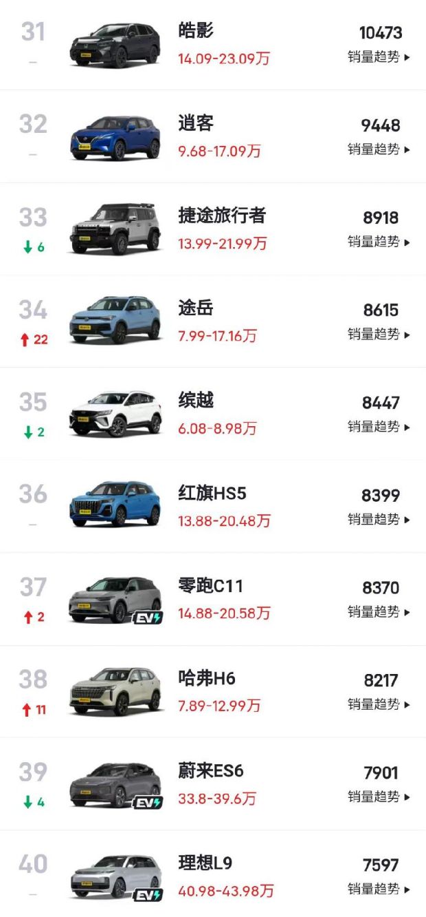 吉利缤越仍是燃油小型SUV销量冠军,9月零售销量8447辆,在SUV销量榜中排名第35位。