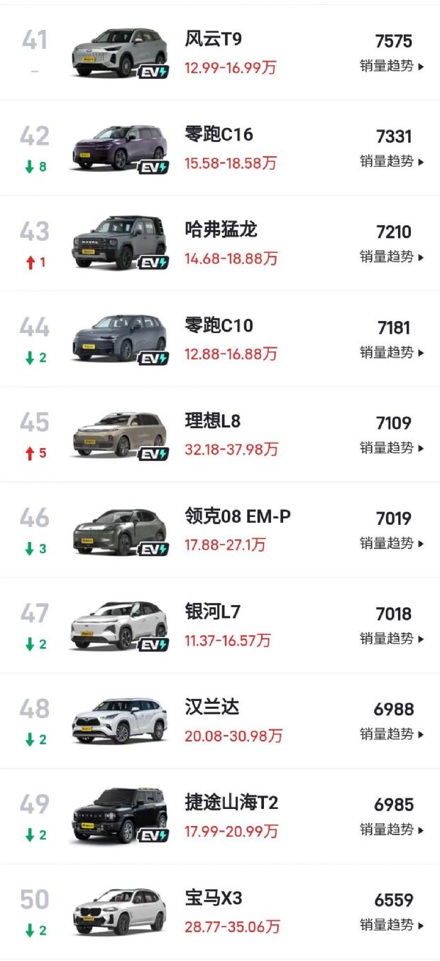 深蓝S07本月销量大幅增长,以12152辆的销量排名第27位,首次突破万辆销量大关。哈弗大狗、比亚迪唐DM、捷途X70销量均达到1.1万辆,排名第28至第30位。