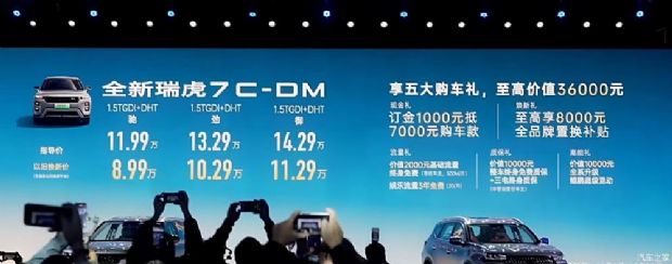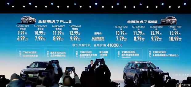 11月1日,2025款奇瑞瑞虎7 PLUS和瑞虎7高能版正式上市。其中瑞虎7 PLUS共推出4款车型,售价9.99-12.99万元,瑞虎7高能版推出4款车型,售价10.79-13.99万元,购车享受订金1000元抵10000元购车款,至高享10000元全品牌置换补贴。瑞虎7 C-DM推出3款车型,售价11.99-14.29万元,购车享受订金1000元抵7000元购车款,至高8000元全品牌置换补贴。