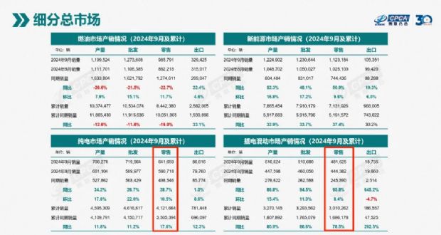 今年1~9月,纯电动(BEV)汽车零售412.17万辆,同比增长17.6%。同期,插电混动(PHEV)累计零售301.03万辆,增速高达78.5%。