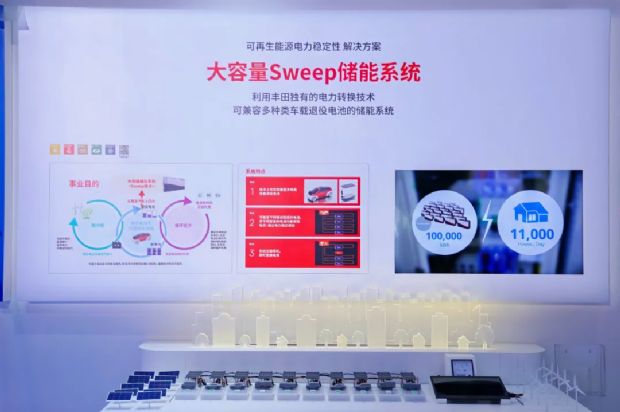 更加值得关注的是,丰田在本届进博会上,就首次展出了Sweep电池系统。该系统可兼容多种类型、不同衰减程度的车载废旧电池,用于储存光伏、风力发电等再生能源电力,充分发挥废旧电池的剩余价值。
