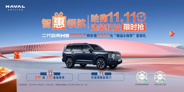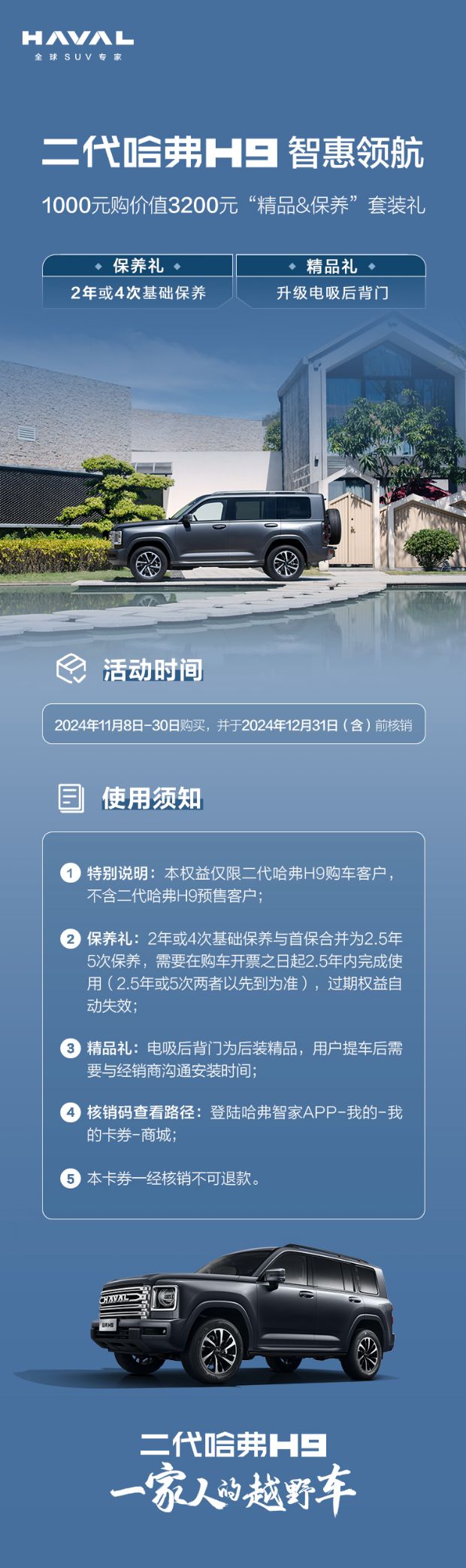 即日起,消费者购买二代哈弗H9,便可通过哈弗智家APP首页/商城焦点图位置参与“智惠领航 哈弗11.11套装权益限时抢”专题活动,支付1000元即可获得价值3200元的“精品&保养”套装礼。在这份诚意满满的礼遇中,保养礼以2年或4次基础保养的形式呈现,为消费者提供了全方位的保养服务,确保每次出行都安心无忧;精品礼则是升级电吸后背门,让每次开关门都更轻松自如,极大提升了人们的用车体验。