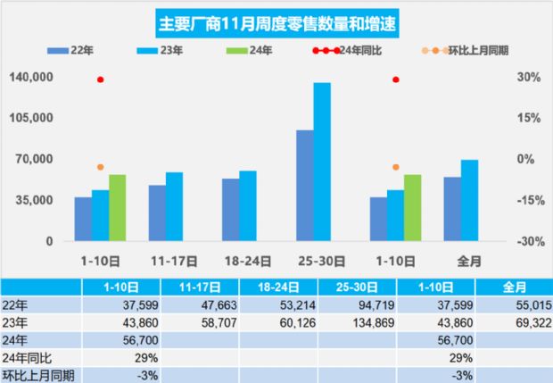 乘联会最新数据显示,2024年11月上旬(1-10日),乘用车市场零售量达到了56.7万辆,同比增长了29%,虽然较上月同期略有下降3%,但整体趋势依然强劲。新能源车市场的表现更是令人瞩目,新能源乘用车零售销量达到了31万辆,同比暴涨70%,较上月同期也增长了10%。