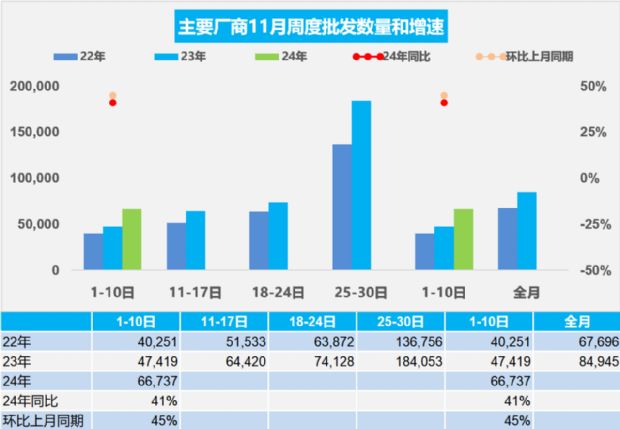 在厂商批发销量方面,11月1-10日全国乘用车厂商批发量达到了66.7万辆,同比增长了41%,较上月同期更是增长了45%。其中,新能源乘用车厂商批发销量达到了35万辆,同比增长了78%,较上月同期也增长了36%。