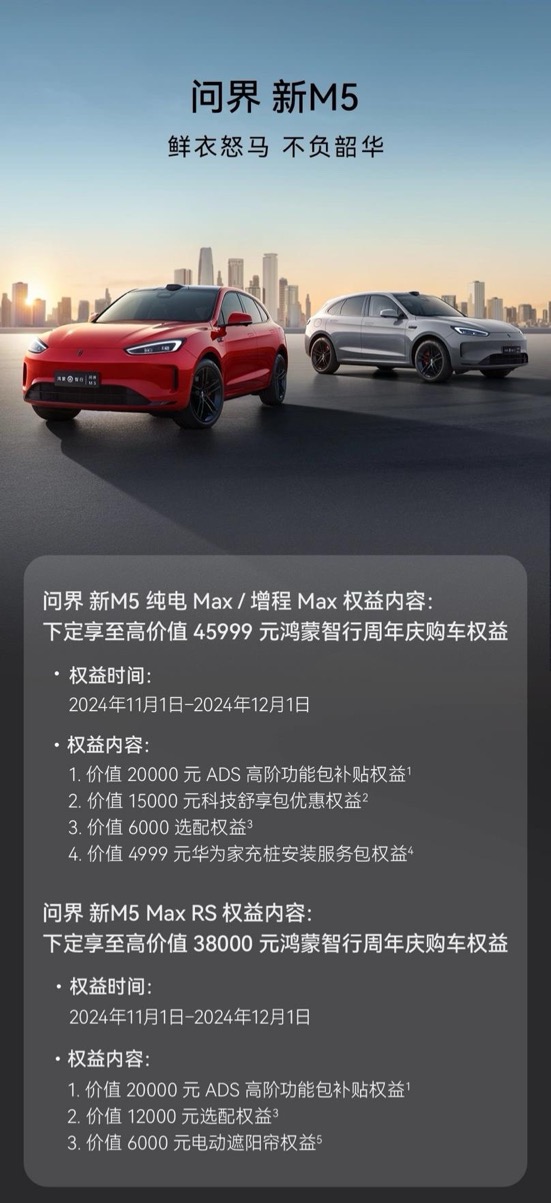 结合上述,集高颜值、强性能、超智慧的问界新M5绝对是25万级别智价比首选。何况目前官方还有优惠政策:即日起至12月1日期间下定问界新M5纯电Max、增程Max,享至高价值45999元鸿蒙智行周年庆购车权益;下定问界新M5 Max RS享至高价值38000元鸿蒙智行周年庆购车权益,还可享2.49%的金融低息优惠。当前车展火热进行中,欢迎大家去鸿蒙智行展台赏车,相信这款车会带你更多惊喜。