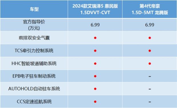 而指导价同为6.99万元的帝豪仅配有EBA刹车辅助控制系统、TCS牵引力控制系统、HHC智能坡道辅助系统等,如EPB电子驻车制动系统、AUTOHOLD自动驻车系统、CCS定速巡航系统等辅助功能要在指导价7.89万元及以上车型才配备。