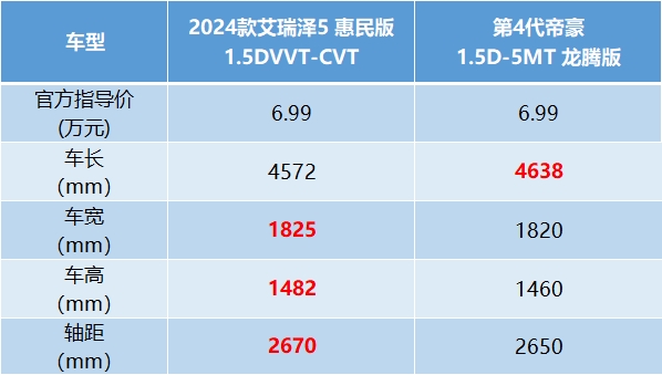 再看第4代吉利帝豪,其车身的长宽高尺寸分别是4638mm、1820mm、1460mm,轴距是2650mm,车长虽然比2024款艾瑞泽5惠民版长了66mm,但轴距却短了20mm。