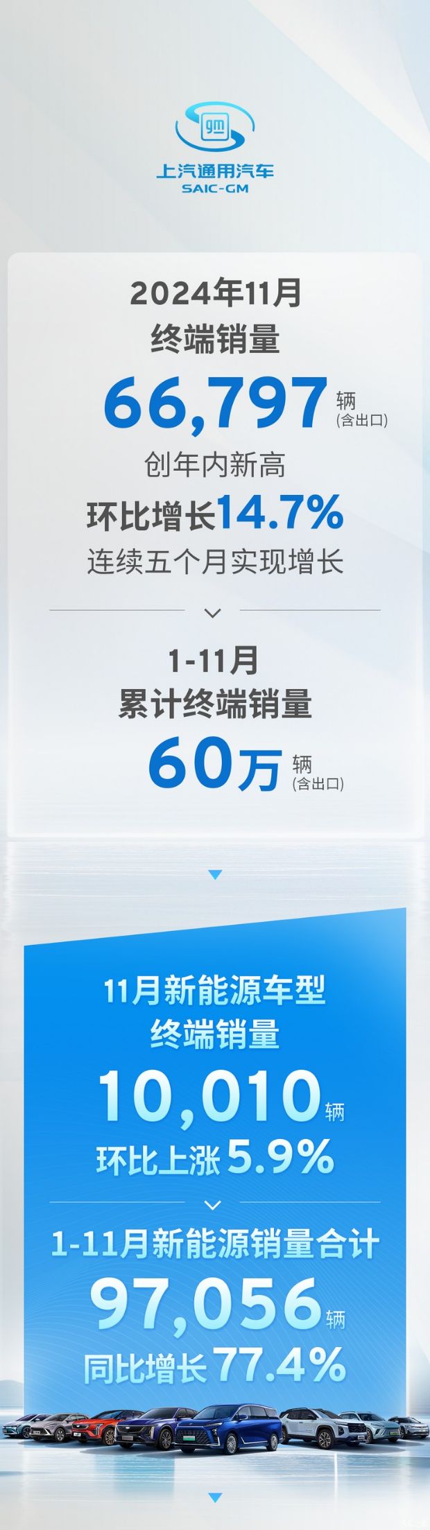 在新能源方面,2024年11月上汽通用新能源销量又一次突破万辆大关,达到10010辆,环比10月份增长5.9%。今年1-11月,上汽通用累计售出新能源车97056辆,相比去年同期增长77.4%。